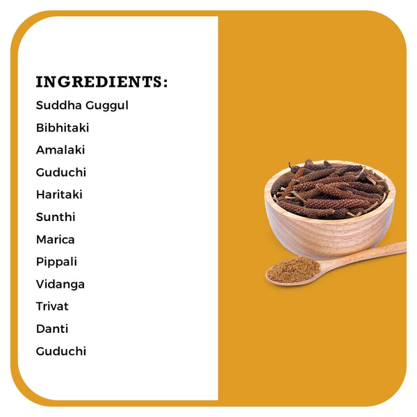 Key Ingredients– Suddha Guggul, Haritaki, Bibhitaki, Amalaki, Guduchi.                                                                                                      Powder of: Haritaki, Bibhitaki, Amalki, Sunthi, Marica, Pippali, Vidanga, Trivat, Danti, Guduchi.