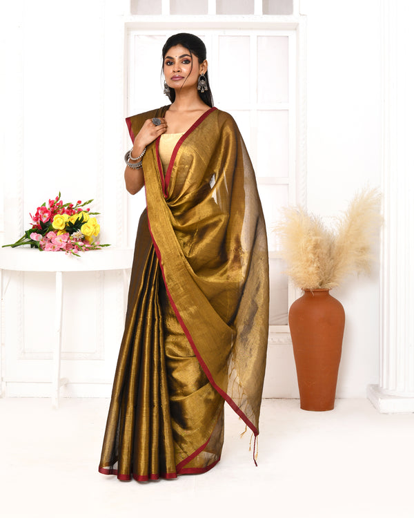 Piyari Fashion Women's Gold Dual Tone Organic Tissue Saree With Blouse Piece