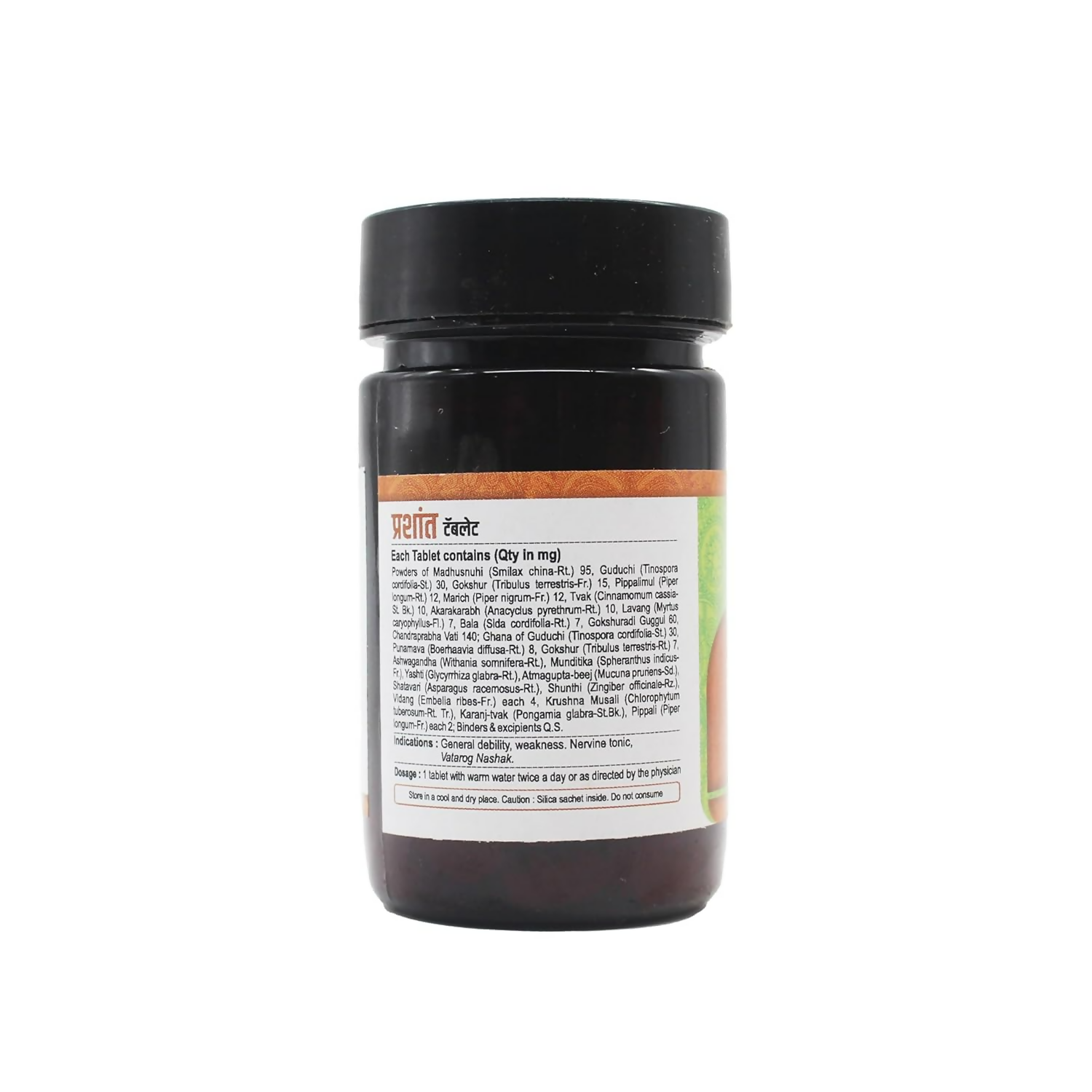 Santulan Ayurveda Prashant Tablets are prepared using a blend of traditional herbs including Madhusnuhi (Smilax china), Guduchi (Tinospora cordifolia), Gokshur (Tribulus terrestris), Pippalimul (Piper longum), Marich (Piper nigrum), Tvak (Cinnamomum cassia), Akarakarabh (Anacyclus pyrethrum), Lavang (Myrtus caryophyllus), Bala (Sida cordifolia), Gokshuradi Guggulu, Chandraprabha Vat, Ashwagandha (Withania somnifera), Munditika (Sphaeranthus indicus), Yashti (Glycyrrhiza glabra), Atmagupta-beej (Mucuna pruriens), Shatavari (Asparagus racemosus), Shunthi (Zingiber officinale), Vidang (Embelia ribes), Krushna Musalli (Chlorophytum tuberosum), Karanj-tvak (Pongamia glabra), and Pipali (Piper longum), along with binders and excipients.