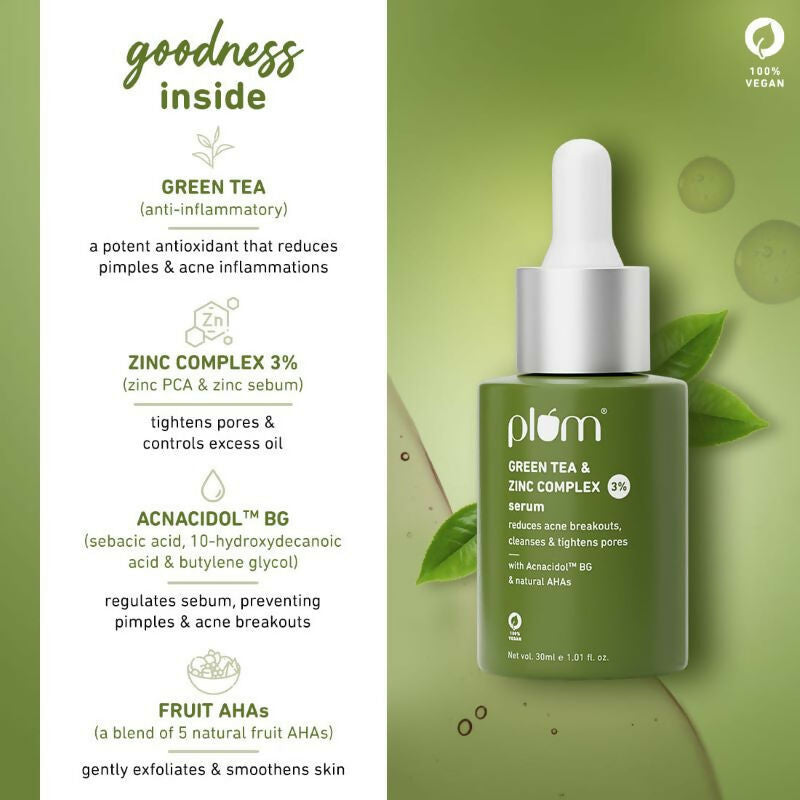 • Plum Green Tea & Zinc Complex 3% Serum fights acne by tightening pores and reducing the occurrence of acne breakouts. Green tea, one of nature's most powerful antioxidants helps reduce inflammation while zinc prevents the development of new bacteria. When used together in an effective formula, these two ingredients help reduce active acne and the formation of future acne.
