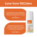 • T.A.C Whitening Underarm Serum is designed odour and not leave white marks on your skin. The Under arm roll on for women contains skin-nourishing ingredients such as Lemon, Aloe Vera, Licorice and others that give hydrating effect on the skin, leaving your skin feeling extremely smooth and velvety.