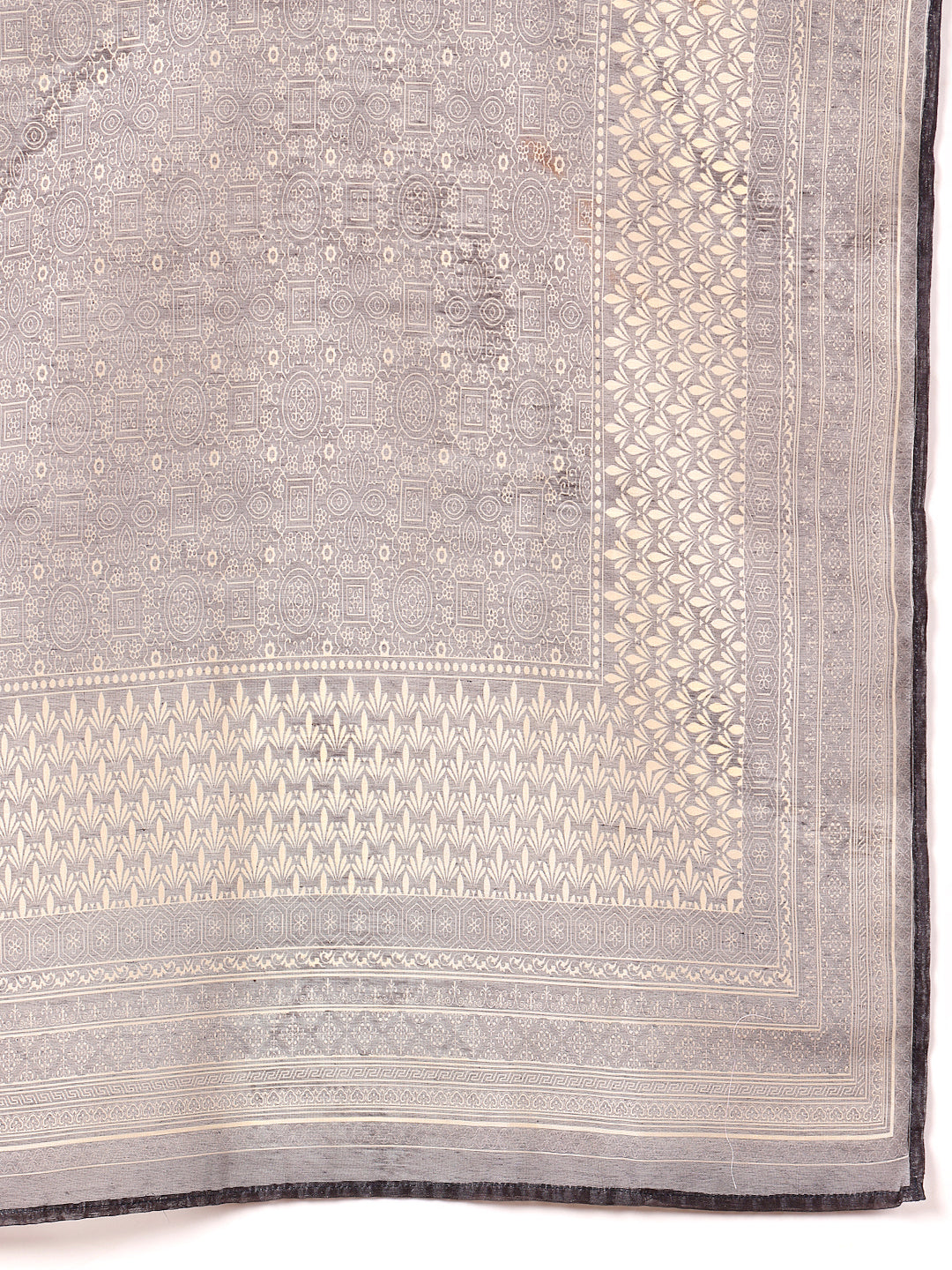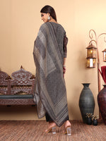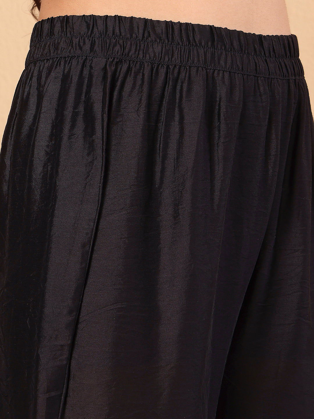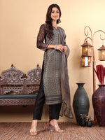 Black Geometric Printed Mandarin Collar Chanderi Silk Sequins Embellished Kurta Three Quarter Sleeve With Side Slit Paired With Bottom And Dupatta