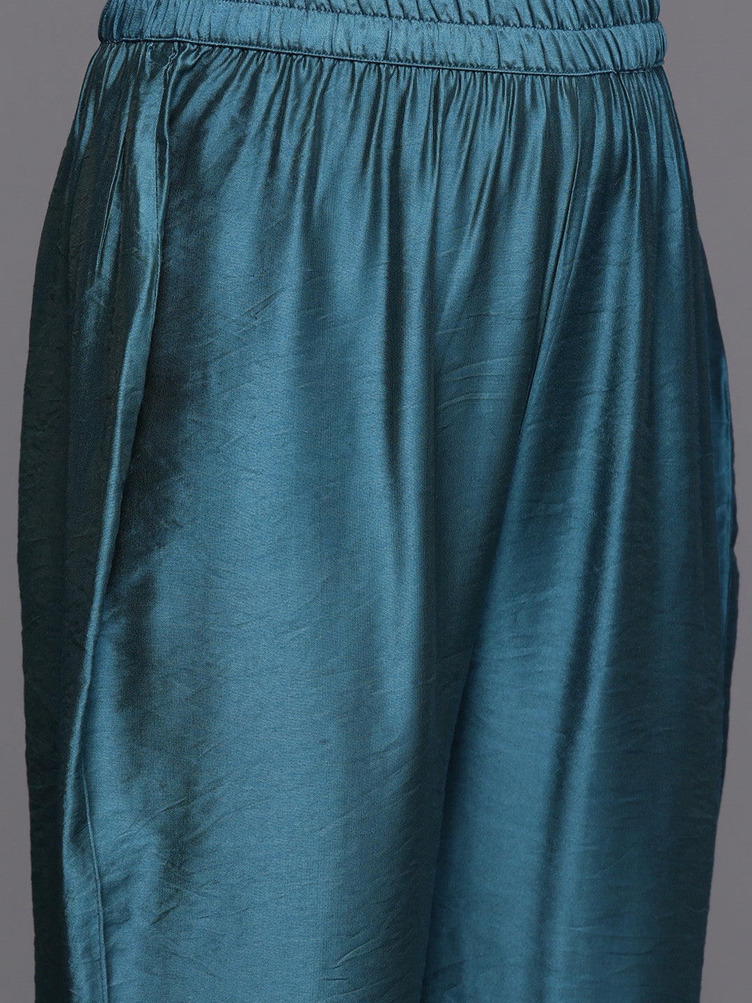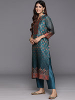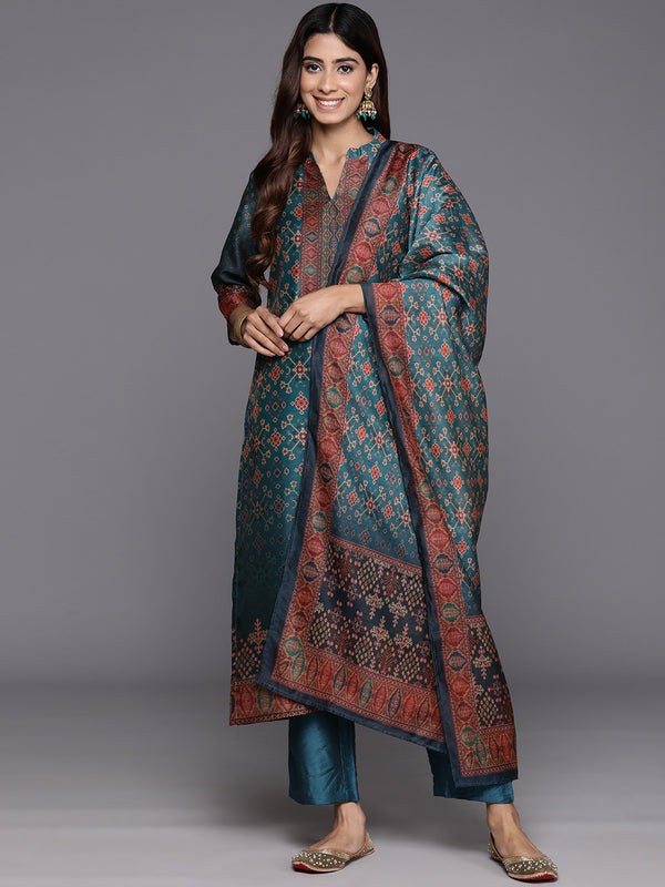 Teal & Beige Patola Printed Mandrin Collar Neck With Slit Detail, Three Quarter-Sleeve, Straight Kurta With Side Slit Paired With Solid Bottom & Printed Dupatta.