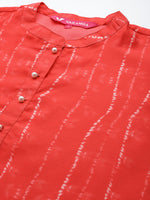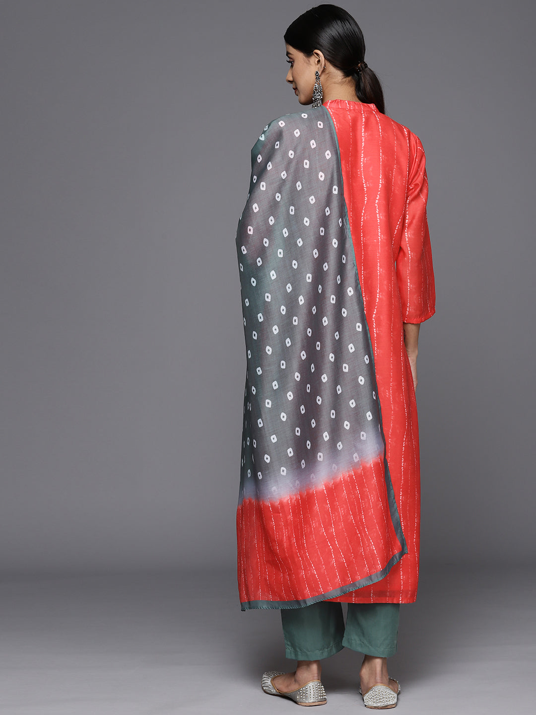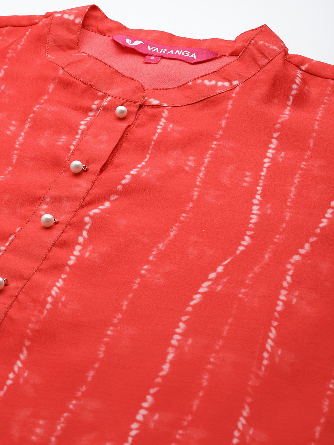 Red Bandhani Printed Kurta, Mandarin Collar Embellished With Pearls In Placket, Three Quarter Sleeves, Straight Kurta Paired With Contrast Solid Bottom And Bandhani Printed Dupatta