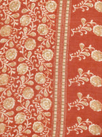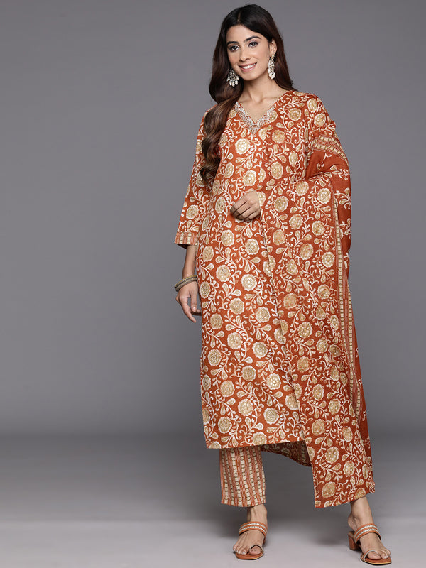 Rust Floral Foil Printed Embroidered V- Neck Three Quarter Sleeves Straight Kurta Paired With Tonal Printed Bottom And Dupatta
