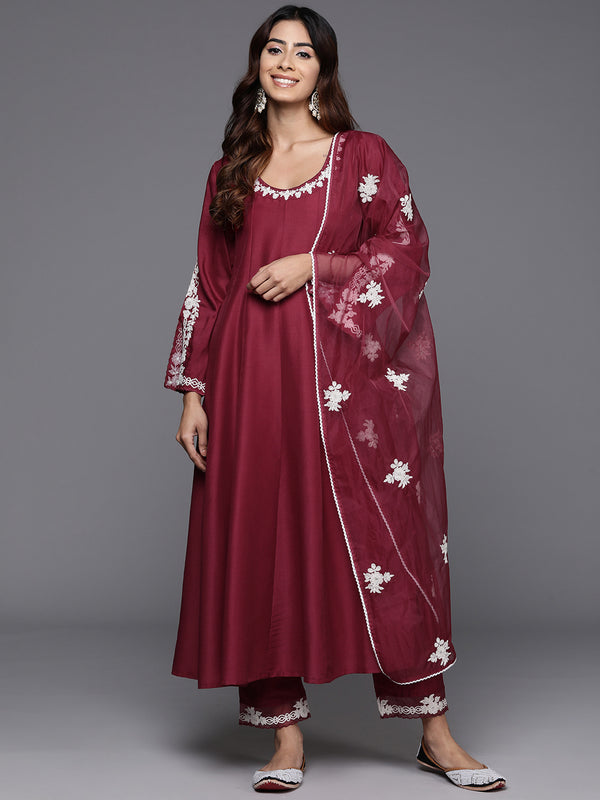 Varanga Women Thread Embroidered Round Neck With Full Sleeve Anarkali Kurta Paied With Tonal Bottom And DupattaMaroon Thread Embroidered Round Neck...