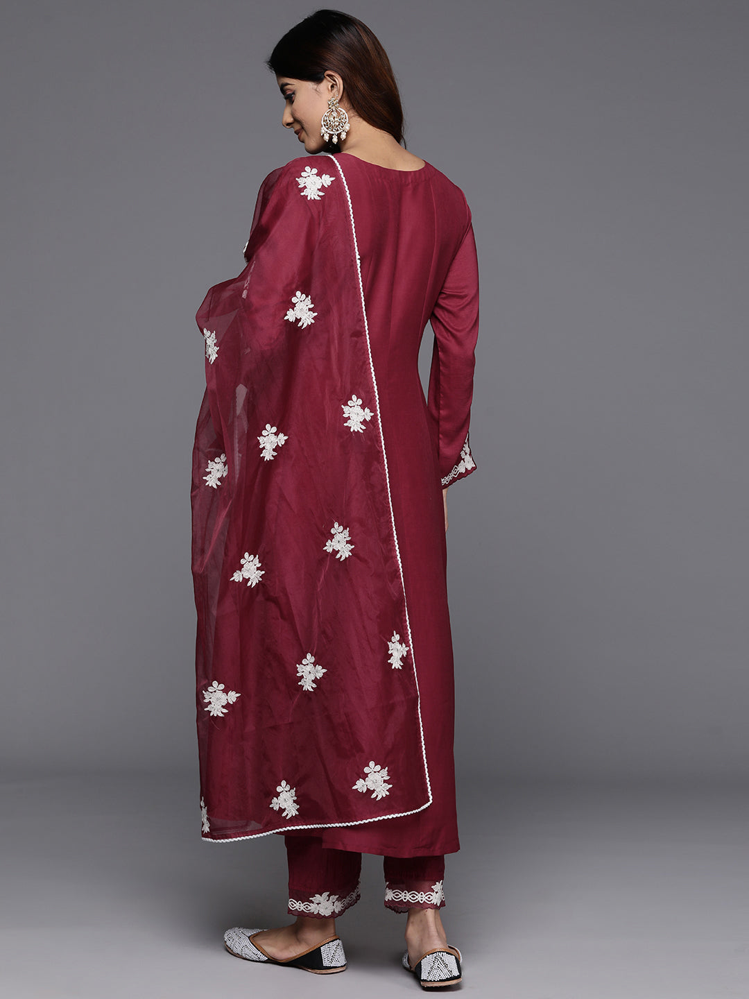 Maroon Thread Embroidered Round Neck With Full Sleeve Embroidered Slit Detailed Anakarli Kurta Paired With Tonal Bottom And Dupatta With Four Side Cotton Fringes
