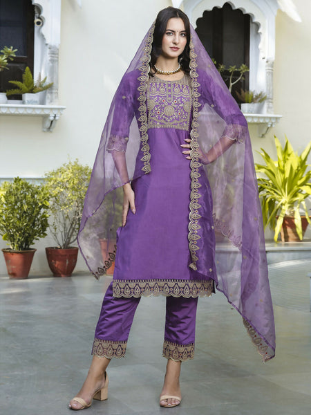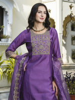 Vellora Royal Purple Silk Blend Embroidered Casual Suit for WomenStep into graceful style with this royal purple silk blend salwar suit from Vellor...