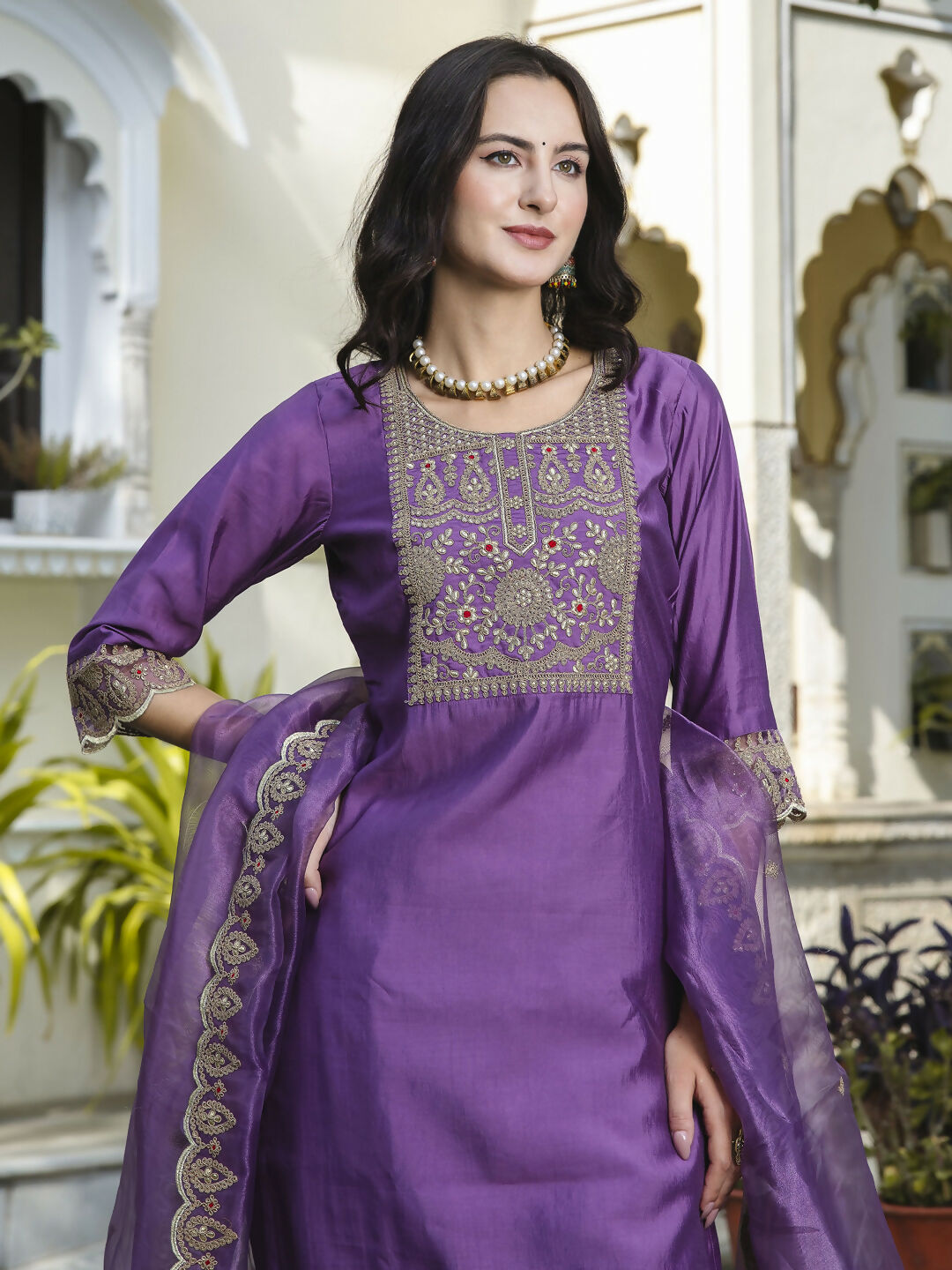 Step into graceful style with this royal purple silk blend salwar suit from Vellora, designed to bring elegance to your casual wardrobe.Featuring exquisite embroidery on the neckline and sleeves, this suit combines traditional craftsmanship with modern comfort, making it perfect for everyday wear, casual outings, or festive occasions.The deep royal purple shade adds richness and sophistication, while the soft, breathable fabric ensures you stay comfortable throughout the day. Completed with a matching bottom and dupatta, this set offers a polished and ready-to-wear ethnic look.If you want an outfit that effortlessly blends style and comfort, this Vellora suit is the perfect choice.
