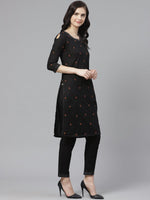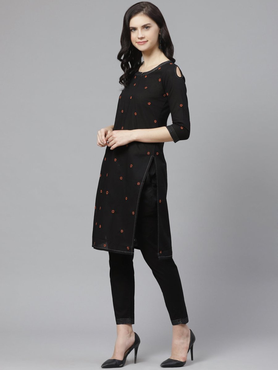 Black and rust orange chikankari embroideres straight knee length kurta with mukaish work, has a keyhole neck, three-quarter sleeves with cut out detail, straight hem, side slits