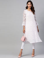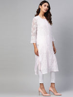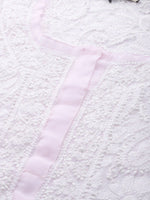 Pink and white?chikankari embroidered straight calf length kurta, has a round neck, three-quarter sleeves, straight hem, side slits