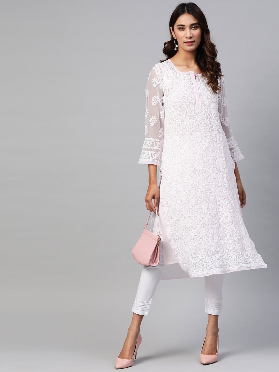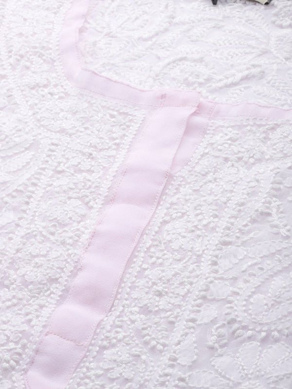 Pink and white chikankari embroidered kurta with trousers