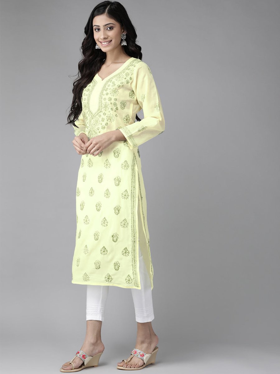 ADA Women Yellow & Green Embroidered Chikankari Handloom Kurta Handloom Kurta with Trousers Product Details Yellow and green embroidered kur...