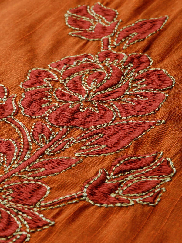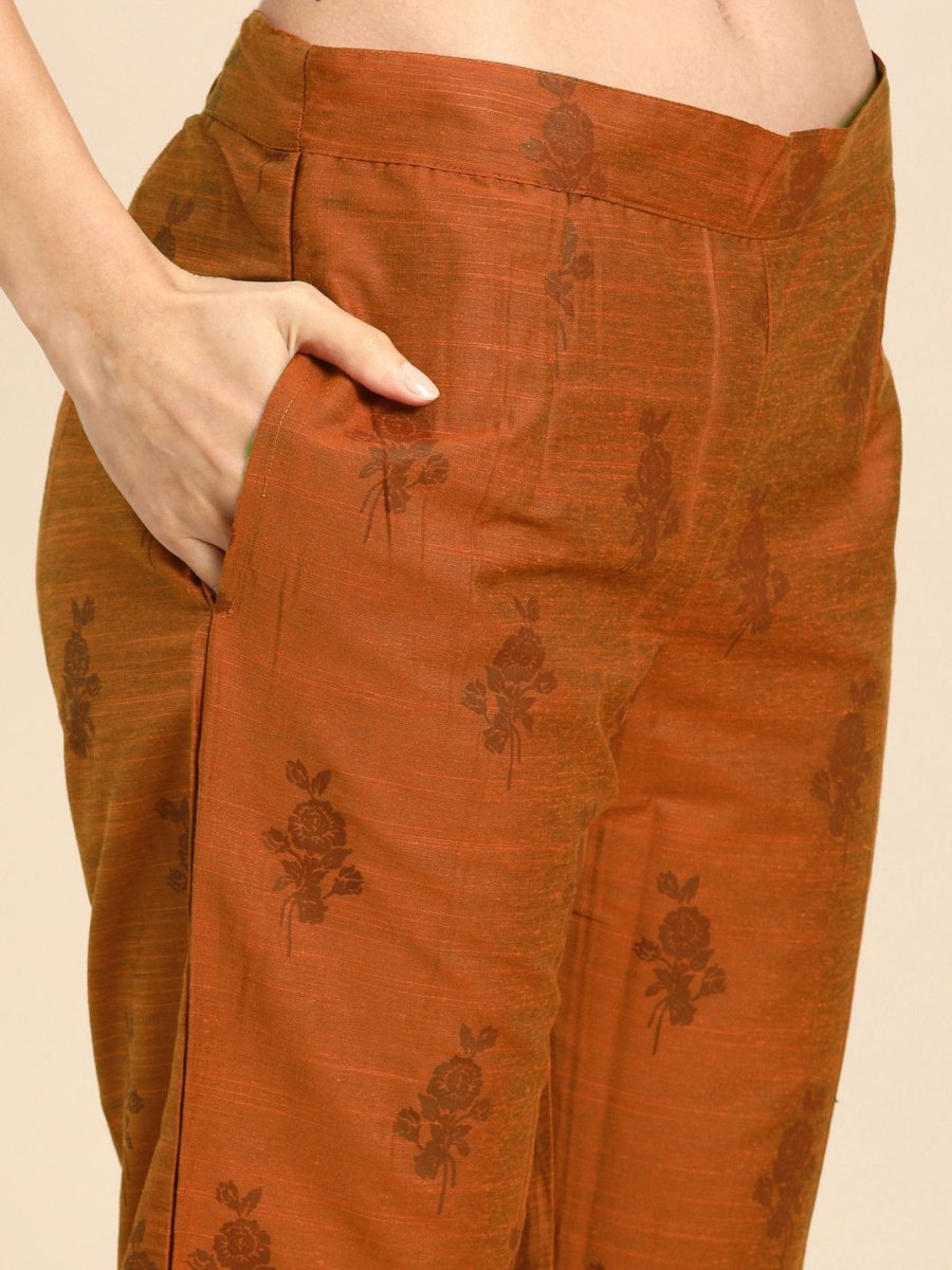 All About You Women Orange Floral Print Embroidered Regular Kurta with Trousers