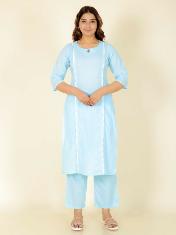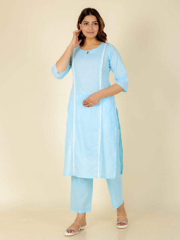 Aramya Blue Soft Cotton Solid Print Panelled Kurta Pant Set for Women