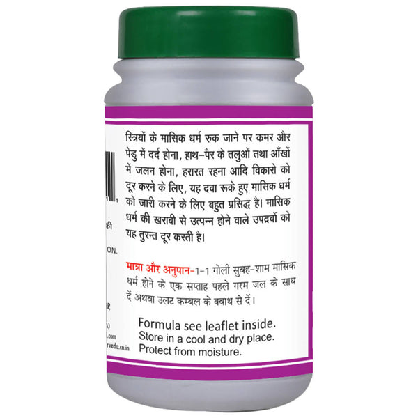 • 1-1 tablet morning and evening one week before menstruation period with lukewarm water or Ulat Kambal kwath.