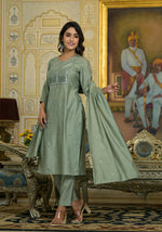 Juniper Women's Mint Viscose Zari & Thread Embroidered Kurta Pant And Dupatta Set With Sequins