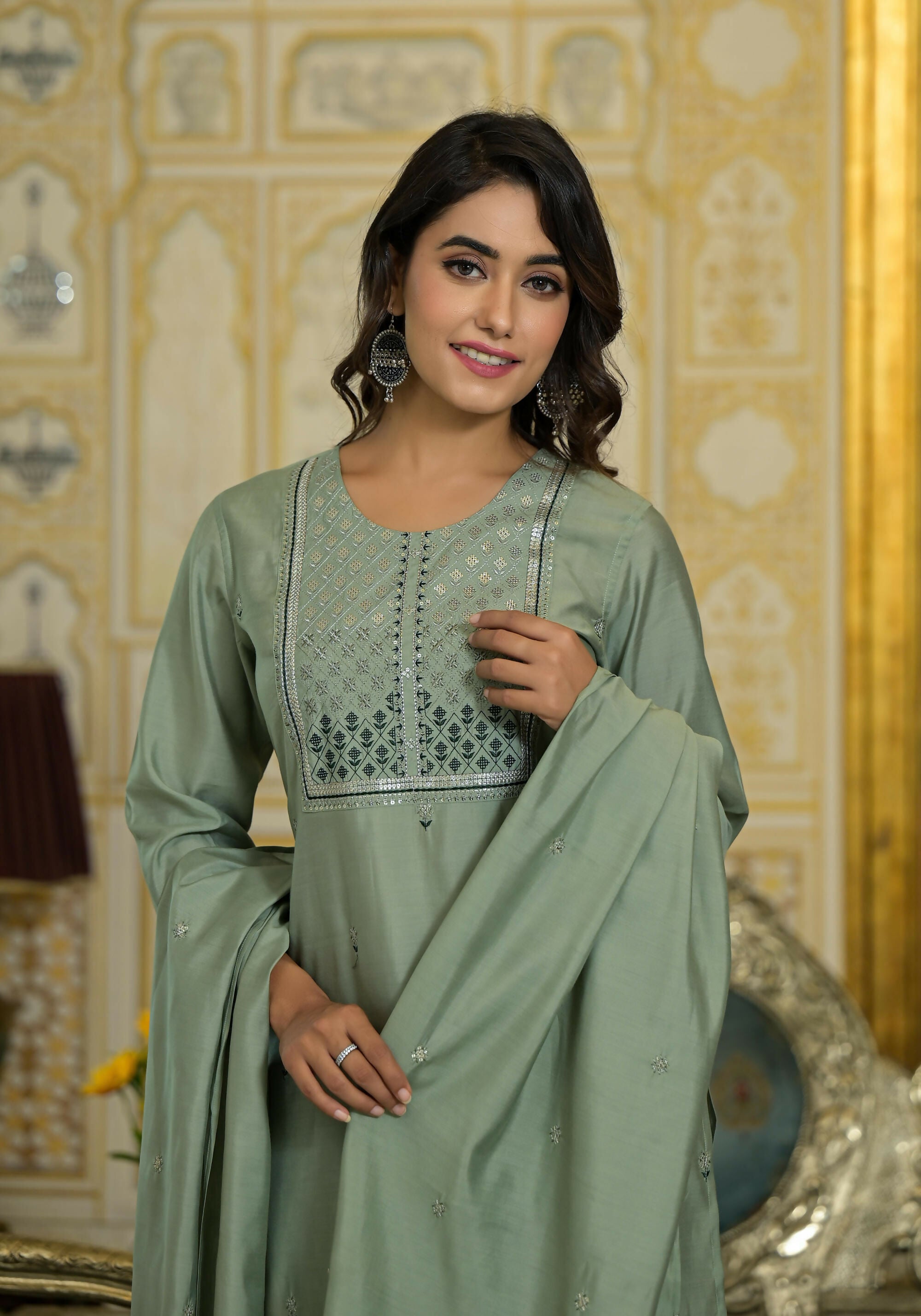 Mint viscose Kurta Pant And Dupatta Set with zari and thread embroidery. Features a knee-length, straight kurta with sequins, a round neck, and three-quarter regular sleeves. Paired with solid slip-on pants and an embroidered dupatta for a graceful, coordinated look.