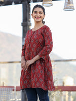 A perfect pick for summer-spring, this maroon shirt style printed cotton tunic is a fusion match for your evening wardrobe as well as daily 9 to 5 work wear. Easily match this cotton tunic with your favorite denim jeans, legging, or trousers to complete your casual look. You can explore and find your favorite collection of Tunics and Tops from KAAJH. Highlights: 3/4 Sleeves, Round Neck, Regular Length, Relaxed Fit, 100% Cotton