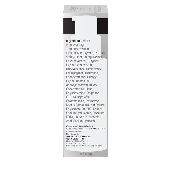 Water, Pentaerythrityl Tetraethylhexanoate, Dimethicone, Glycerin, PPG-15 Stearyl Ether, Cetearyl Alcohol, Stearyl Alcohol, Butylene Glycol, Ceteareth-20, Isohexadecane, Trisiloxane, Dimethicone Crosspolymer, Phenoxyethanol, Caprylyl Glycol, Ammonium Acryloyldimethyltaurate/VP copolymer, Polyacrylamide, Polyethylene, Fragrance, C13-14 Isoparaffin, Chlorphenesin, PTFE, Hydrolyzed Myrtus Communis Leaf Extract, Polysorbate 20, Retinol, BHT, Sodium Hyaluronate, Disodium EDTA, Laureth-7, Ascorbic Acid, Sodium Hydroxide
