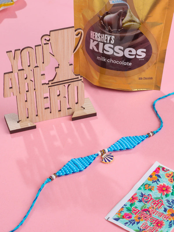 • Style Note: Celebrate the special bond of Raksha Bandhan with the NVR Men Blue Pearls Unique Design Thread Rakhi. Featuring elegant blue pearls in a unique design, this Rakhi adds a touch of sophistication and charm to your celebration. Perfect for your Bhaiya, it symbolizes love, care, and protection. The adjustable thread ensures a comfortable fit for all wrist sizes. The set comes complete with Roli, Chawal, Chandan, Mishri with Assorted MDF wooden stand & 33.6 gm Hershey's Kisses Chocolate for the traditional Raksha Bandhan rituals. A beautiful and meaningful gift to convey your affection and blessings this Raksha Bandhan.