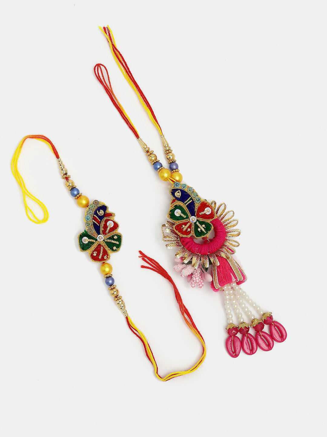 NVR Women & Men Set of 2 Multicolor Thread Work & Beaded Bhaiya Bhabhi Rakhi With Roli Chawal