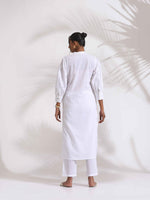 • Elevate your style with this white cotton kurta, adorned with intricate embroidery in front and sleeves, complemented by solid back panels. Paired with white pants, it's an ideal blend of elegance and comfort.