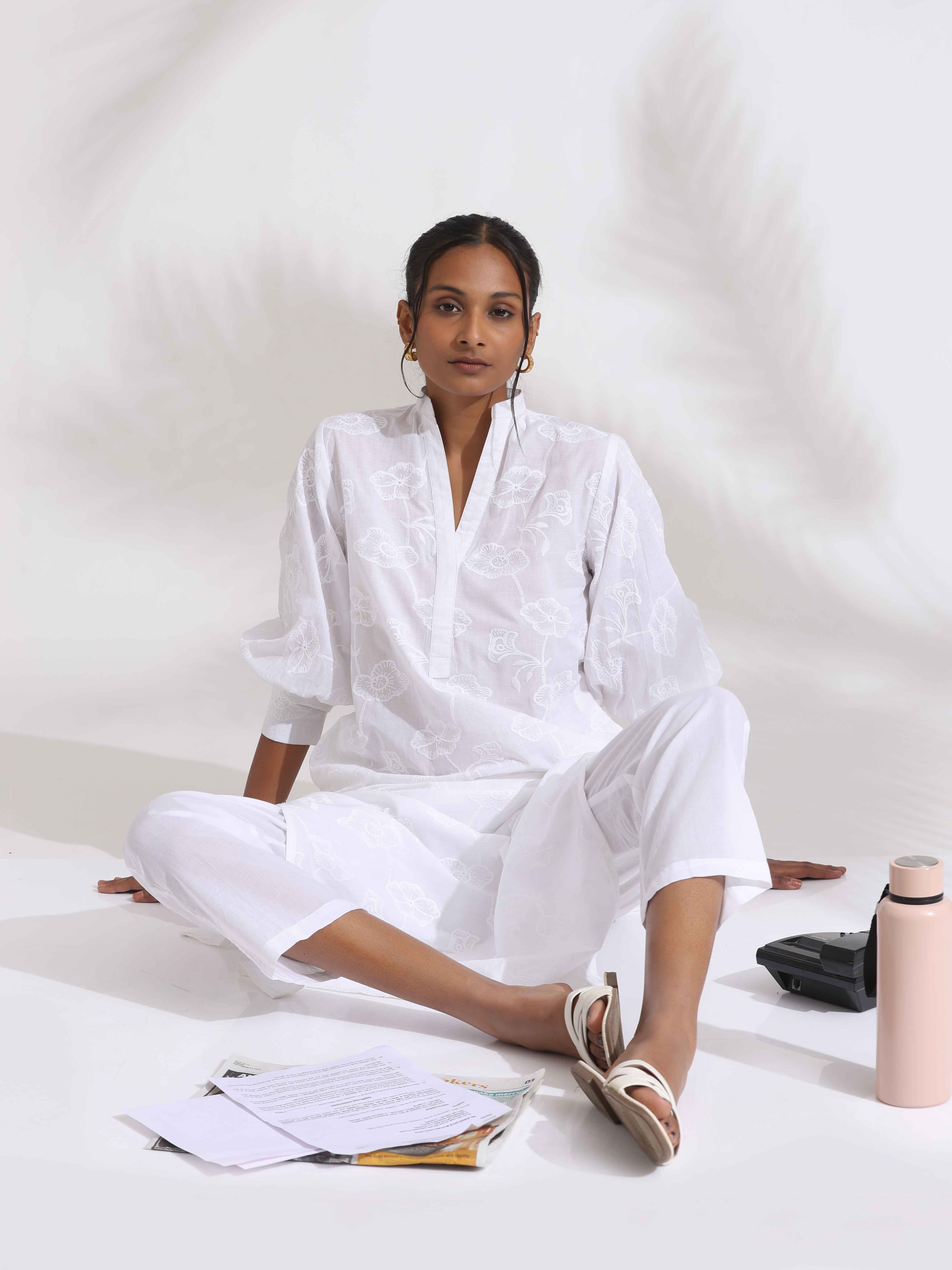 trueBrowns trueBrown White Cotton Schiffli Kurta Set
