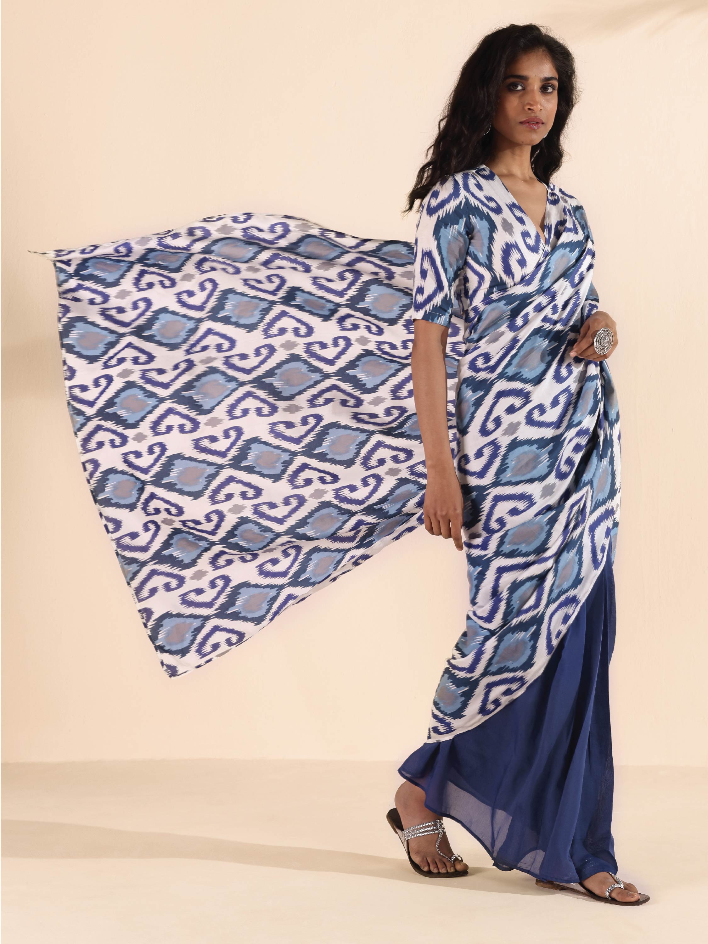 trueBrowns Blue White Muslin Ikat Ready to Wear SareeDescription Muslin Ikat Diamond Printed pre-stitched saree with solid Muslin Silk. Style with ...