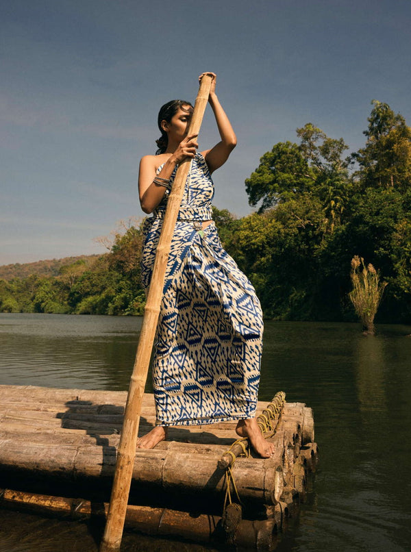 • Muslin Ikat Diamond Printed pre-stitched saree with solid Muslin Silk. Style with a Blouse/Top and a pair of mules to complete the look.