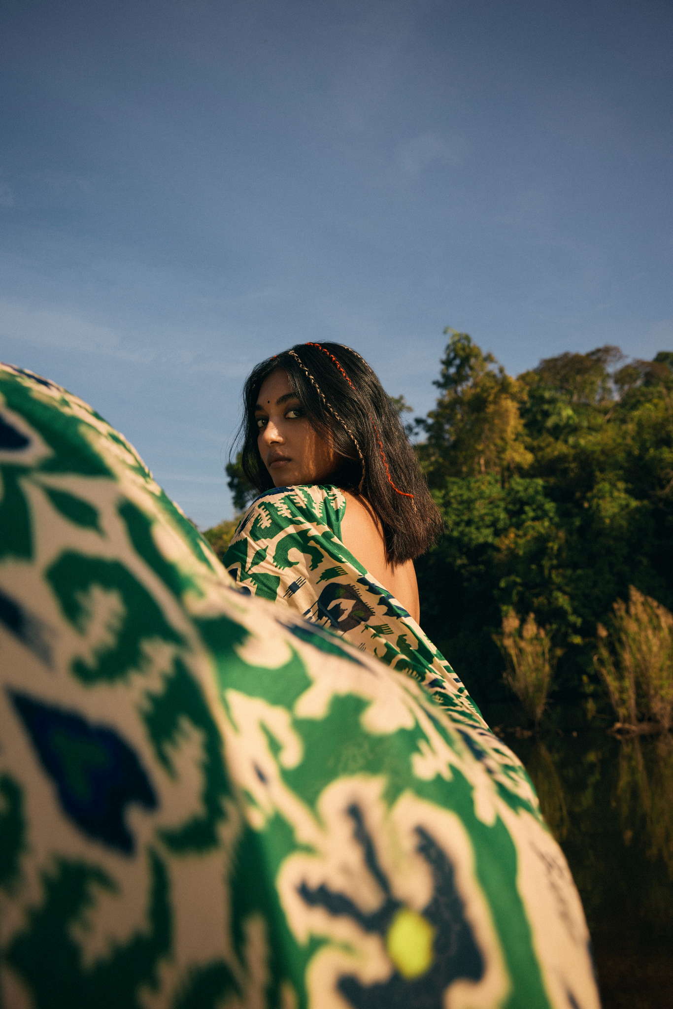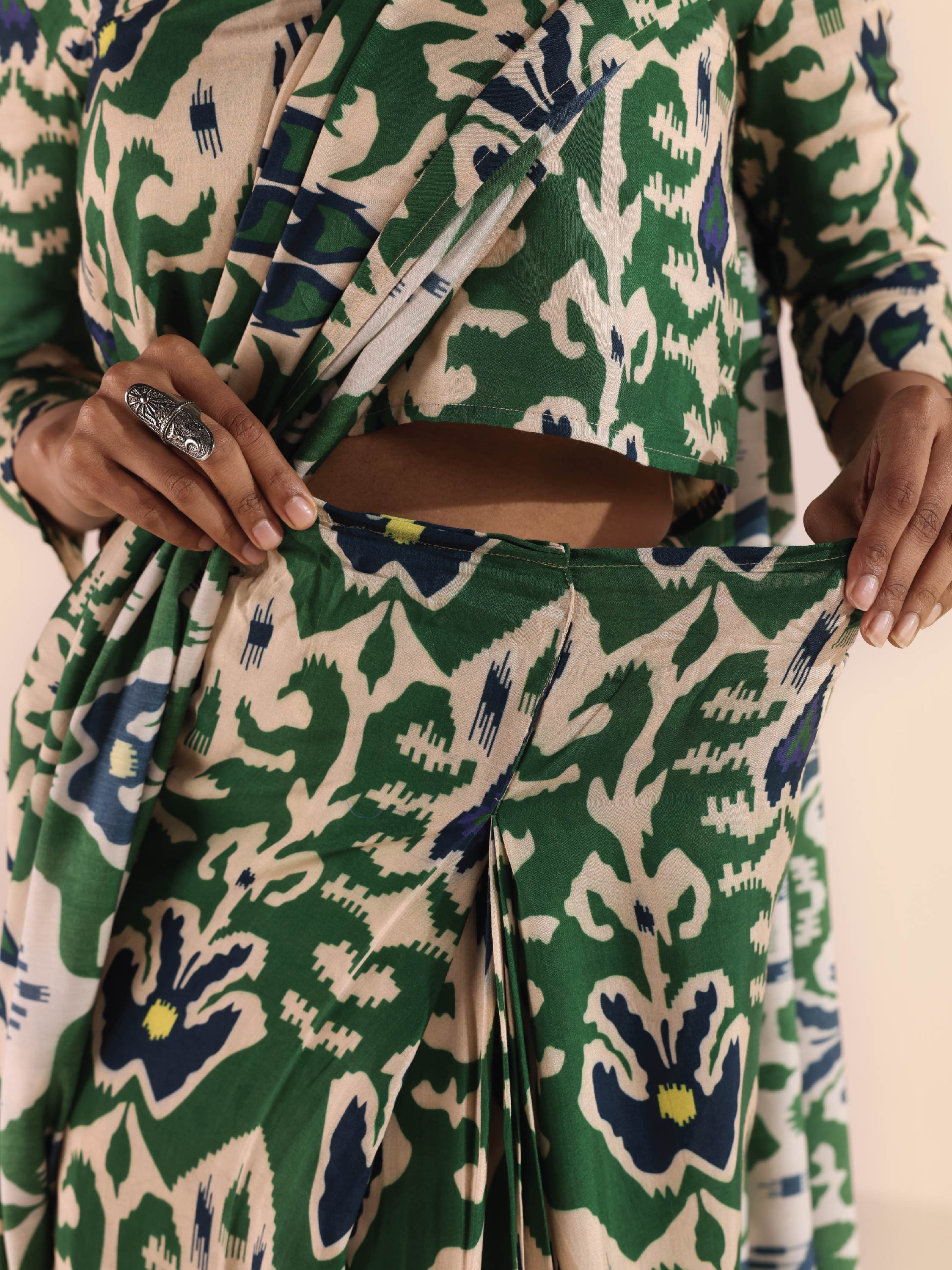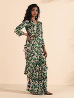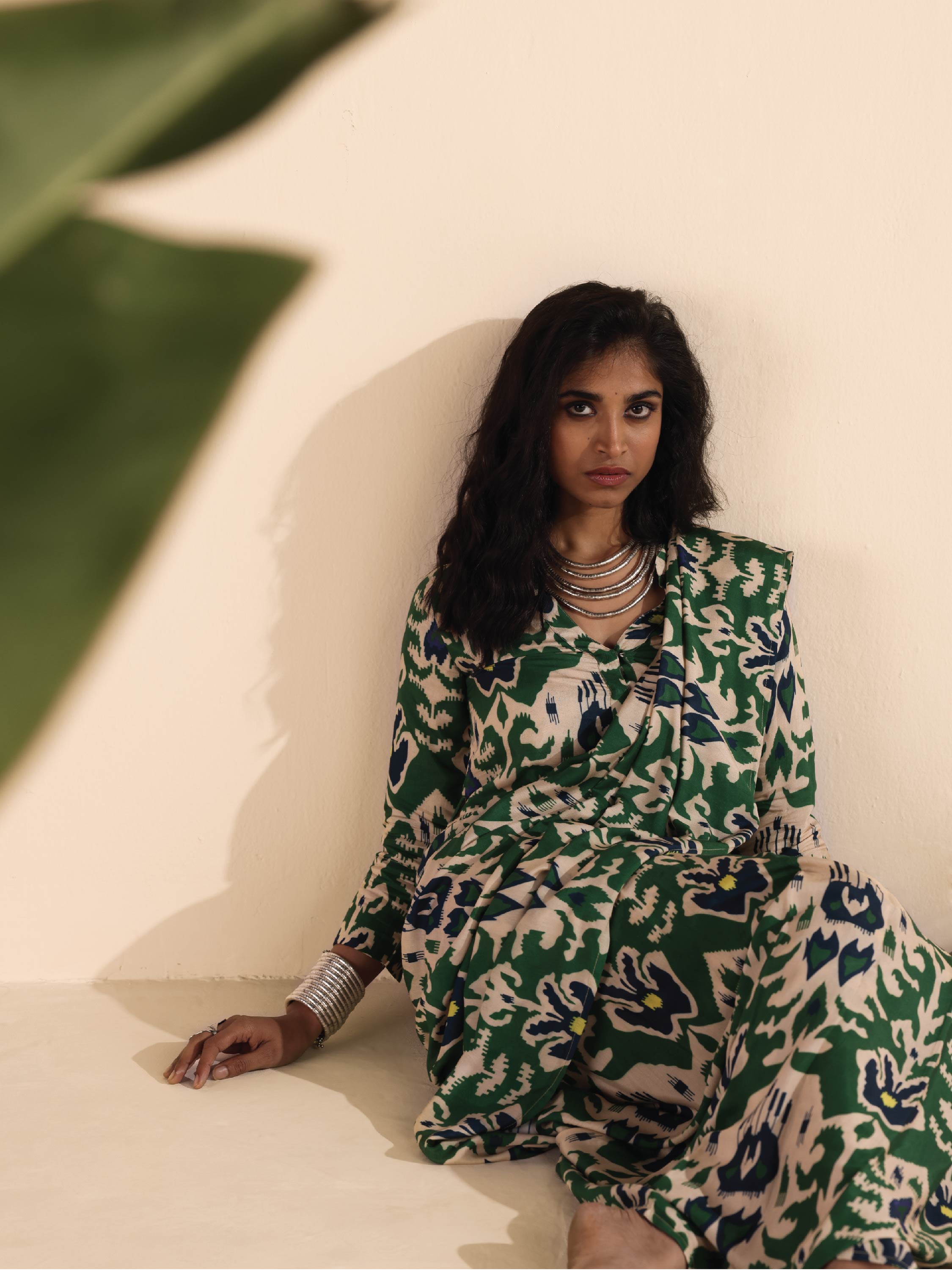 trueBrowns Green Muslin Ikat SareeDescription Muslin Ikat Floral Printed pre-stitched saree. Style with a Blouse/Top and a pair of mules to complet...