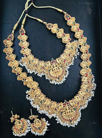 We proudly presents an exclusive combination jewellery set of handcrafted gold plated traditional temple look choker necklace and mid length necklace with matching earrings. This modern jewellery set, which has been inspired by red carpet looks, can be worn with all traditional outfits and is suitable for weddings, festive and traditional occasions.We are intricately hand crafted and designed by professional artisans who use methods similar to the process used for manufacturing real gold jewellery, thus giving the wearer a very premium yet lightweight look.We are of superior quality and are skin friendly as they are made from toxic free materials as per international standards. Please store the jewellery safely in airtight packaging, away from moisture, water, perfume and chemicals and clean with a soft, dry cloth for long life.The length of the necklace can be adjusted according to the style of dori affixed by the wearer. The dori of the necklace will vary with each shipment as designed by artisans. Loose stones and pearls can be fixed back easily and are part and parcel of hand made jewellery.Make your festive occasions more special and memorable than ever before through Our exclusive designer jewellery. We respectfully requests support from customers to minimize return possibilities as we take utmost precautions to ensure our jewellery is packed and sanitized with a strict zero touch policy during this pandemic.This beautiful heavy temple jewellery necklace set if unique with its crafted nakshi work embedded with Ruby Stones on the Long Rani Haar with matching Jhumki earrings