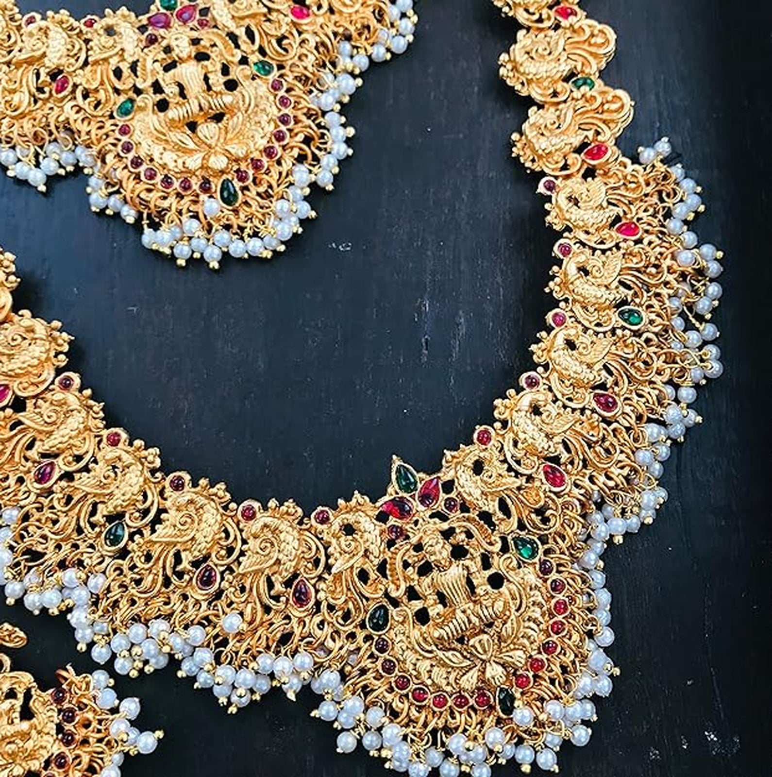 Jewel City Gold-Plated Traditional Goddess Lakshmi Temple Jewellery Bridal Set with Ruby Stone Long Haram Double Necklace SetWe proudly presents a...