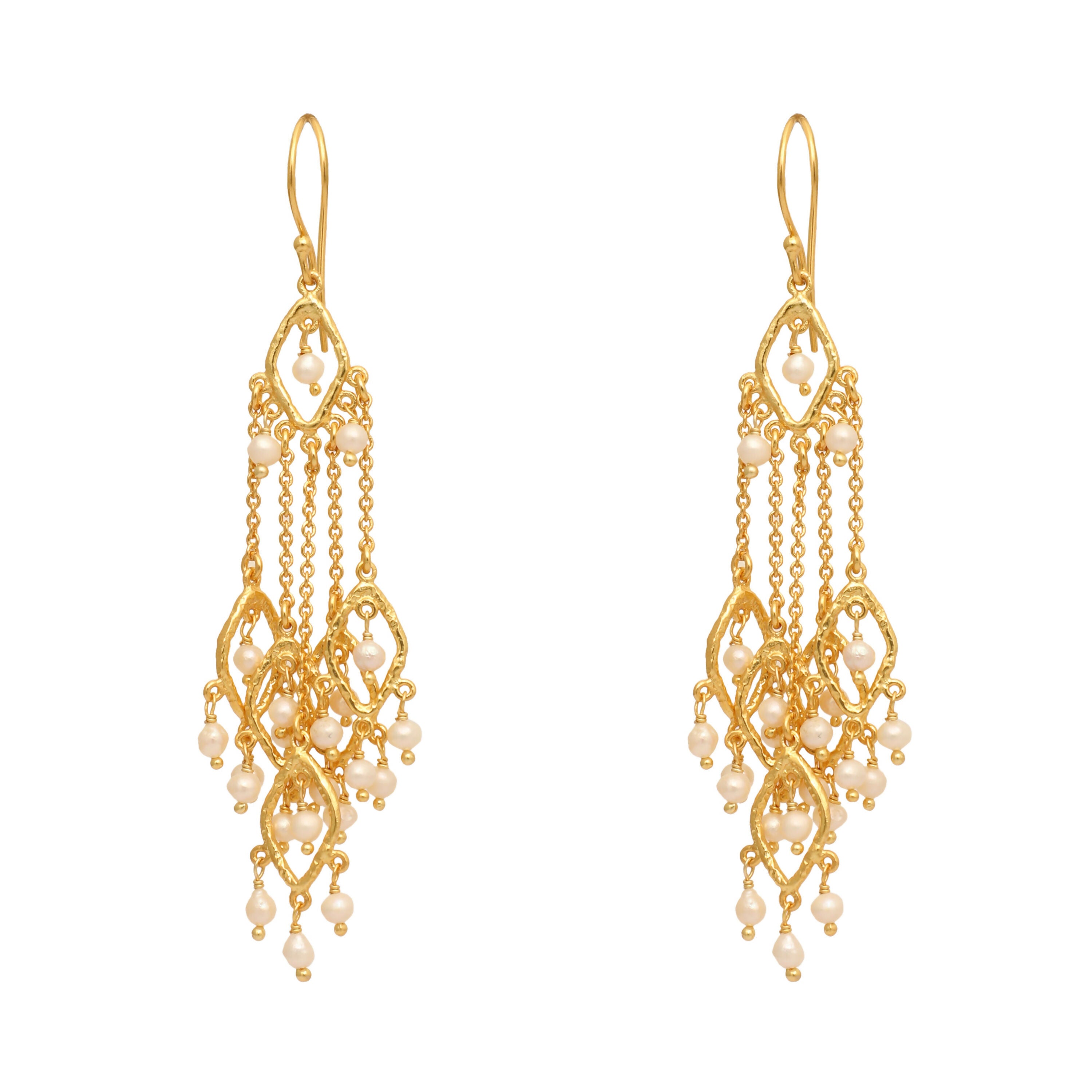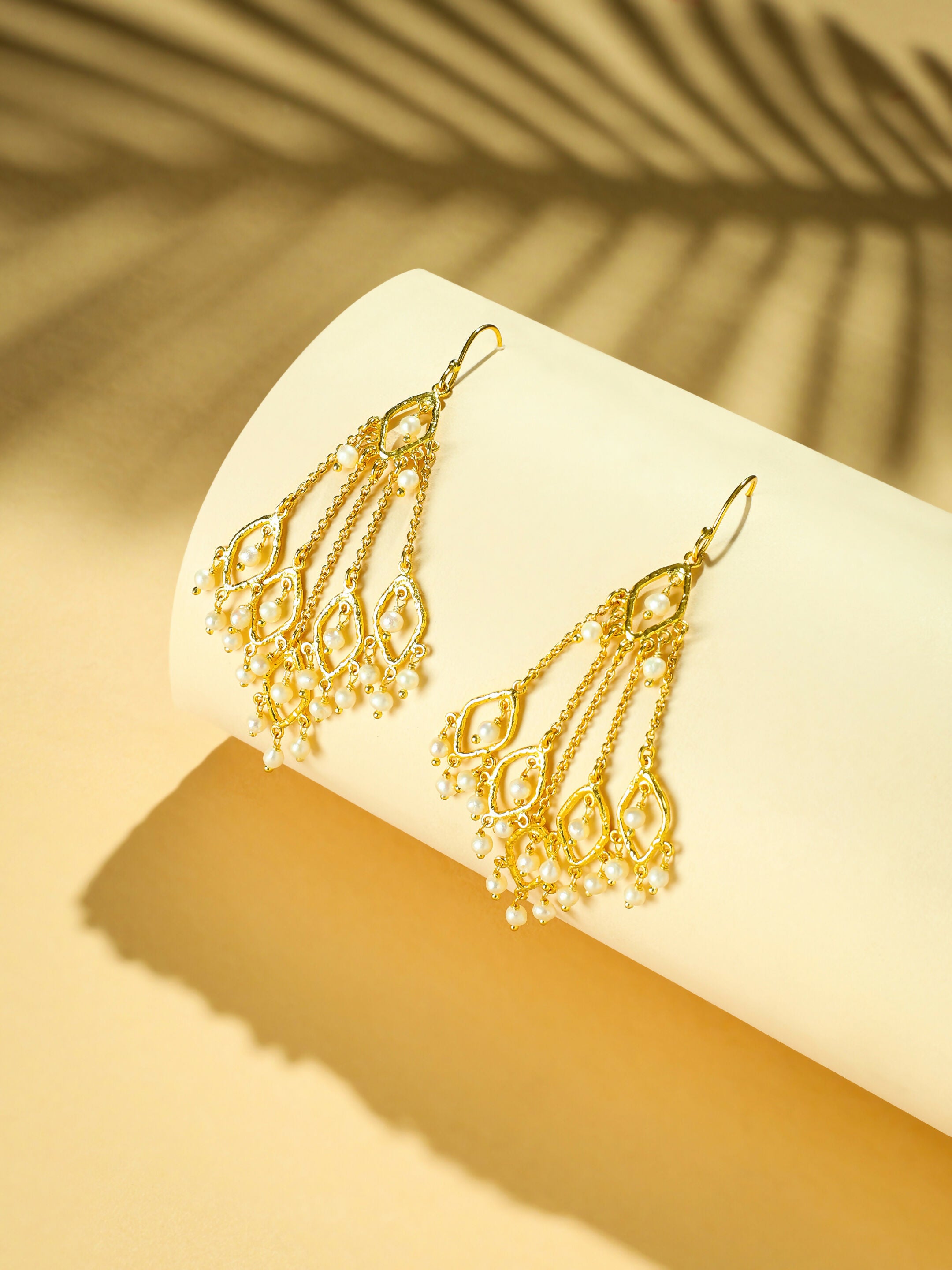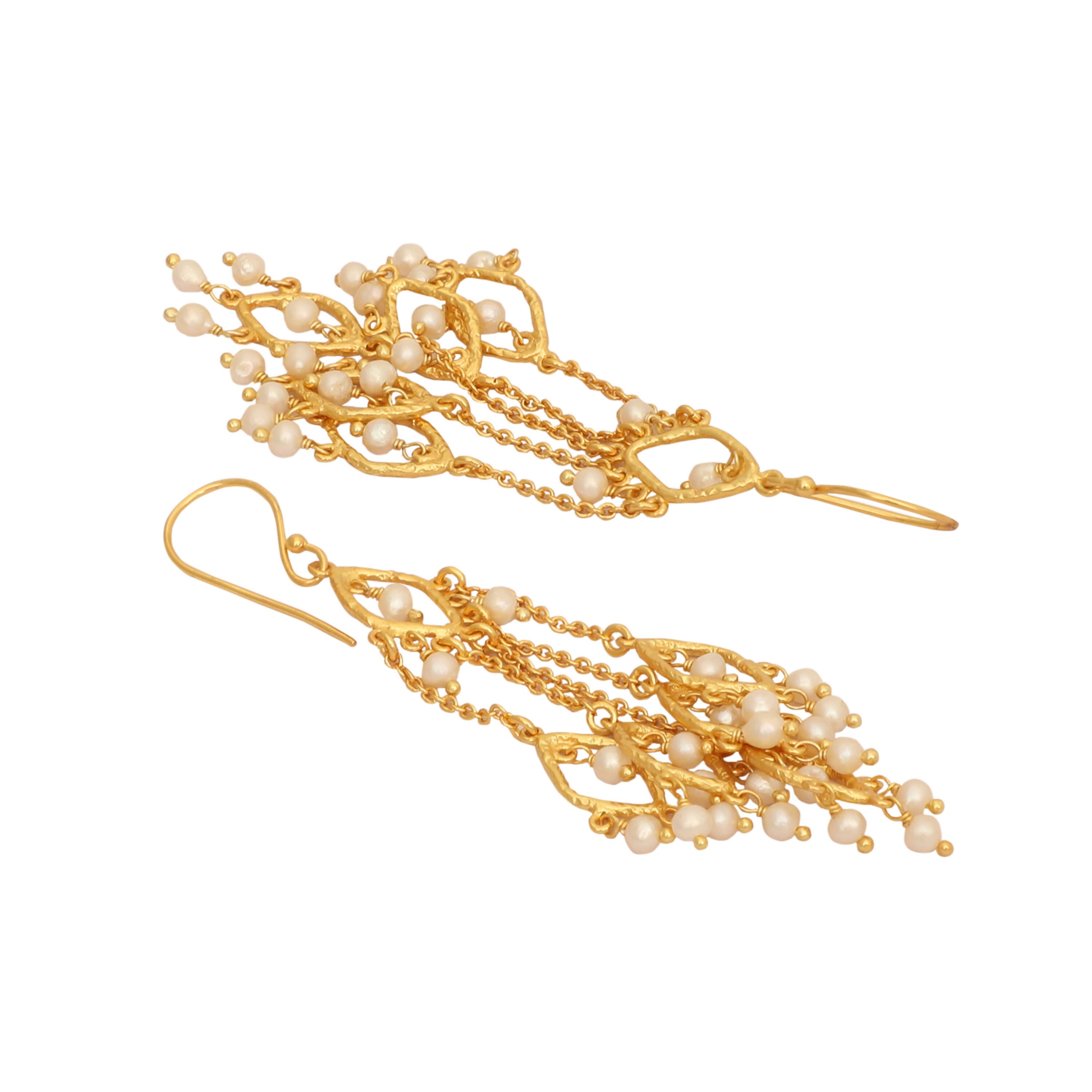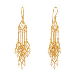 18k gold-plated earrings in unique style, featuring multiple delicate strings adorned with falling pearls. Anti-tarnish and anti-allergic, perfect for an elegant statement look.