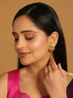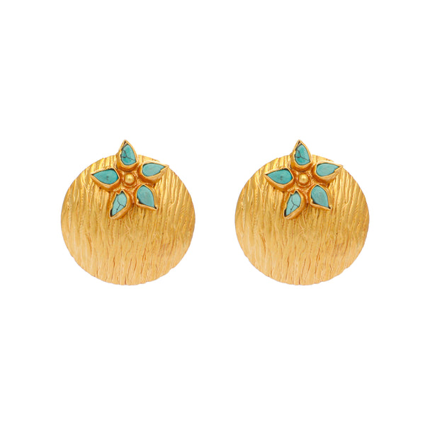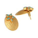 22K Gold-plated, anti-tarnish, and anti-allergic studs featuring delicate flower motif on top, adorned with turquoise stones. Elegant studs offering perfect blend of traditional design and modern charm. Secured with a post and back closure.