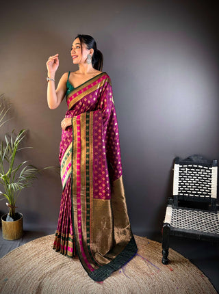 Sonakshi Women's Wine Banarasi Silk Zari Woven Traditional Saree with Blouse
