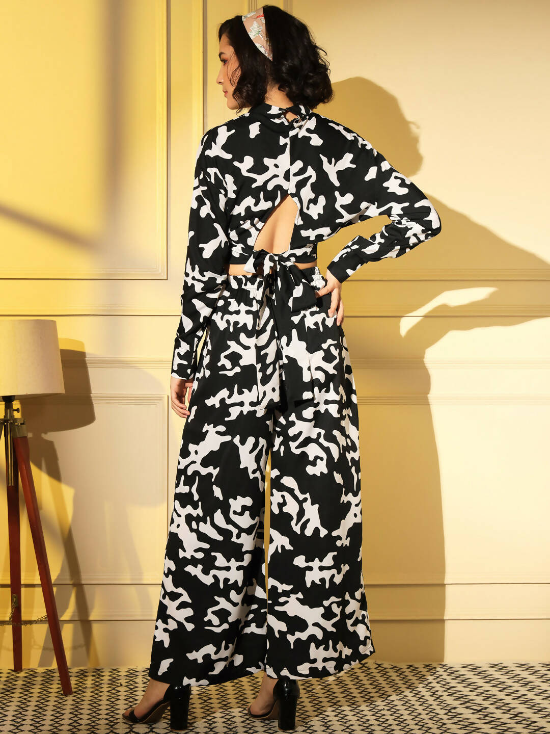 Top : Black Crepe Digital Printed Top with Matching Trouser. Pattern : Digital Printed, Crop style top, Neck-Halter neck, Long sleeves with buttoned cuffs & Straight hemline with Tie knot in back , Length: 30 Inches.