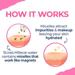 St. Ives Rosy Glow Rose Micellar Water has a special formula that helps in removing makeup effectively. Yes, even the toughest one! This 3-in-1 Micellar Water is complete skincare that cleanses, tones and removes makeup effectively while also nourishing the skin. Use it on the go, while traveling, or anywhere as a face cleanser. It doesn’t require rinsing or harsh rubbing, just a gentle wipe, and you have clean & clear skin. This Gentle Micellar Water consists of micelles that work like magnets to pull out impurities like dust, dirt, sebum, dead skin cells, pollutants, etc.
