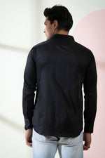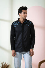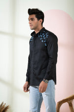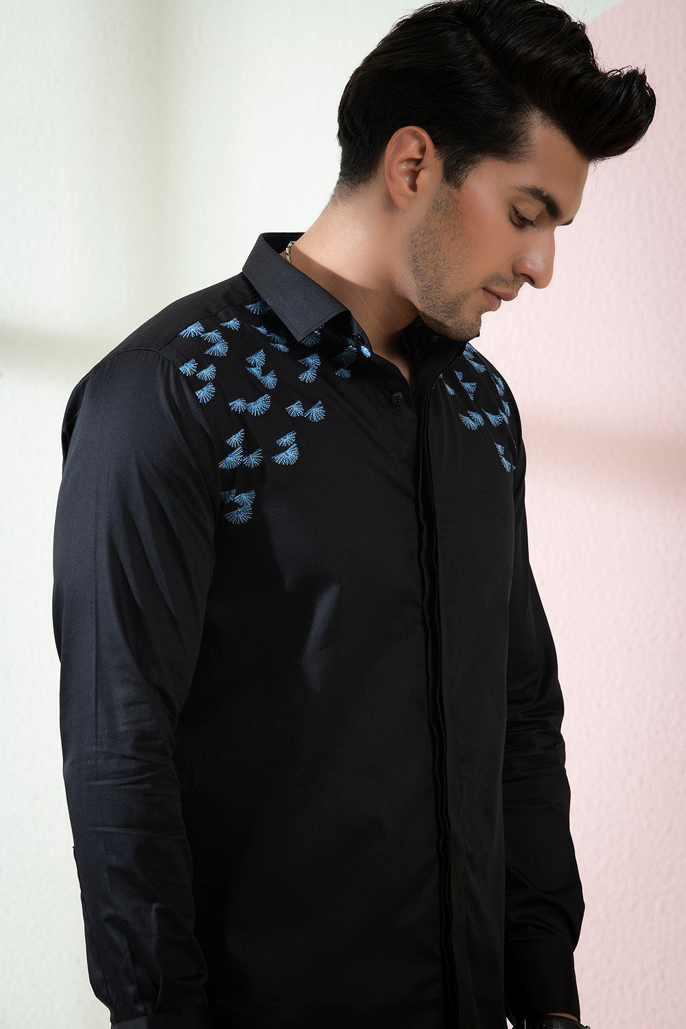 This black shirt is made from luxurious cotton satin and features intricate blue embroidered motifs. The concealed buttons give it a sleek and polished look, making it perfect for formal occasions. The comfortable fabric and elegant design make this shirt a must-have for any stylish wardrobe.