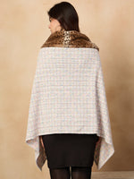 The Multi White Acrylic Fur Poncho offers a vibrant twist on a cozy classic. Featuring a combination of multi-color checks with a dominant white base, this poncho is made from soft, plush acrylic fur fabric for ultimate warmth and comfort. The loose, flowing fit and high collar make it a versatile layering piece that can easily transition from casual to semi-formal looks, perfect for colder days.