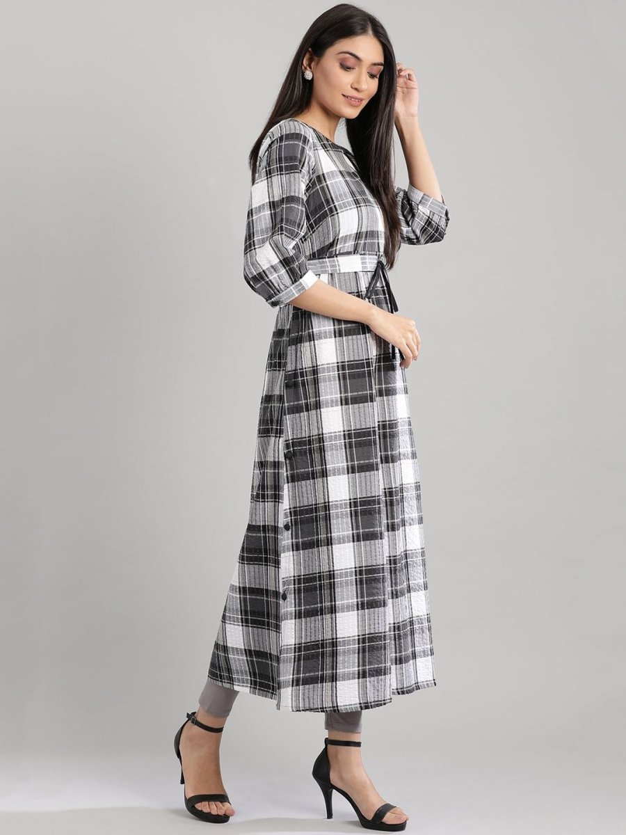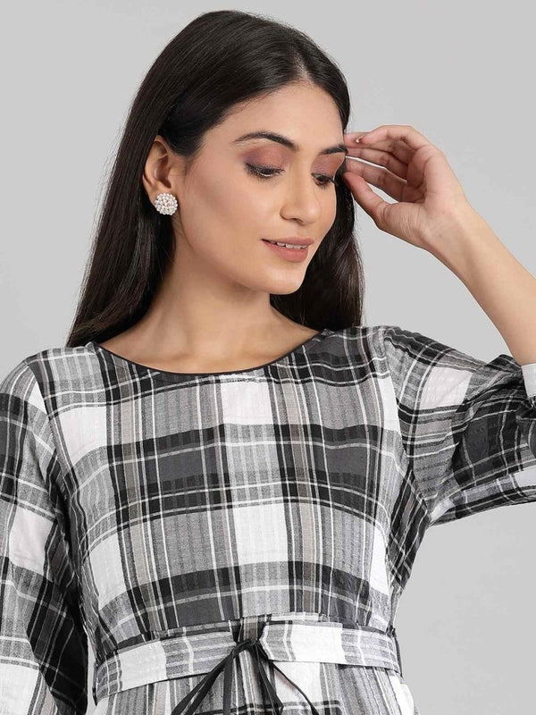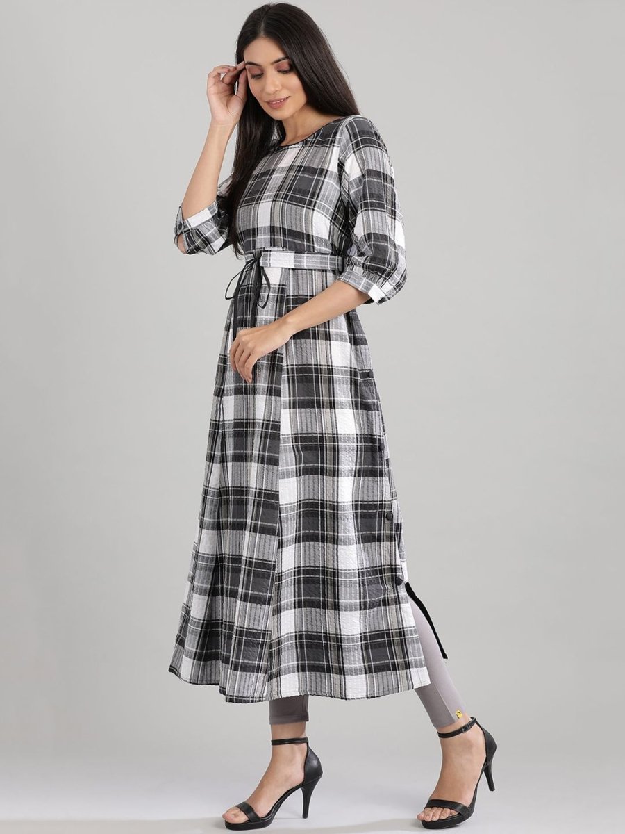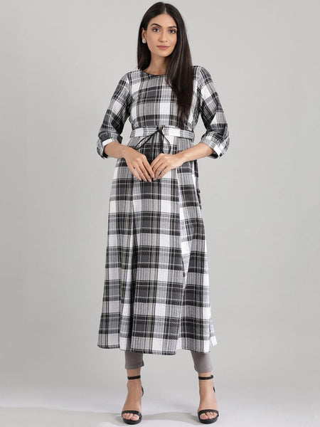 AURELIA Black Checked Empire Midi Dress Product Details Black checked empire dress Round neck Three-quarter, regular sleeves Midi leng...