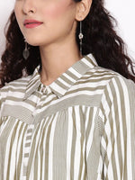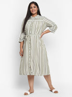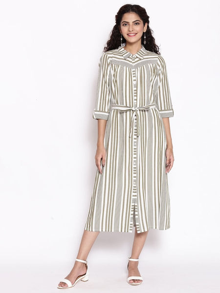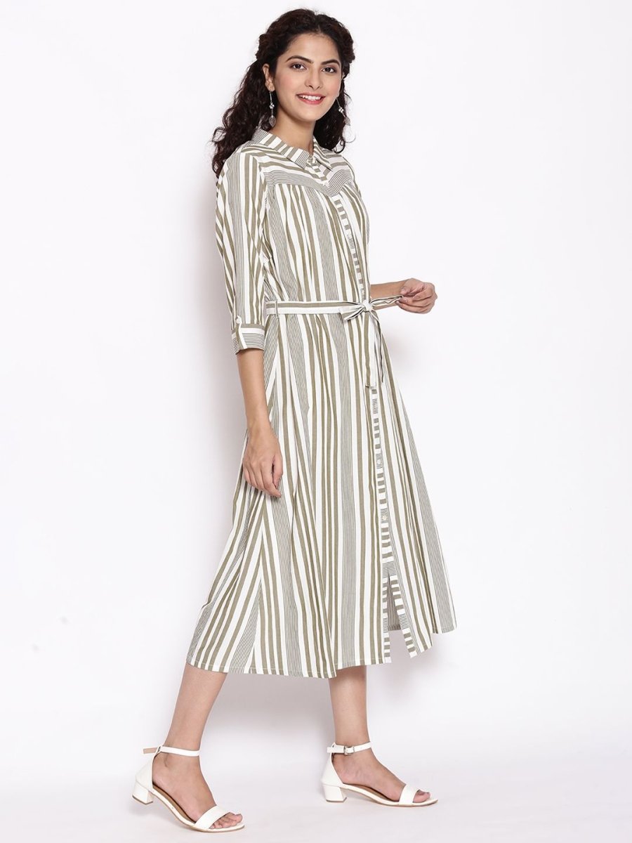 AURELIA Olive Green & White Striped Shirt Midi Dress With Waist Tie Up - Distacart