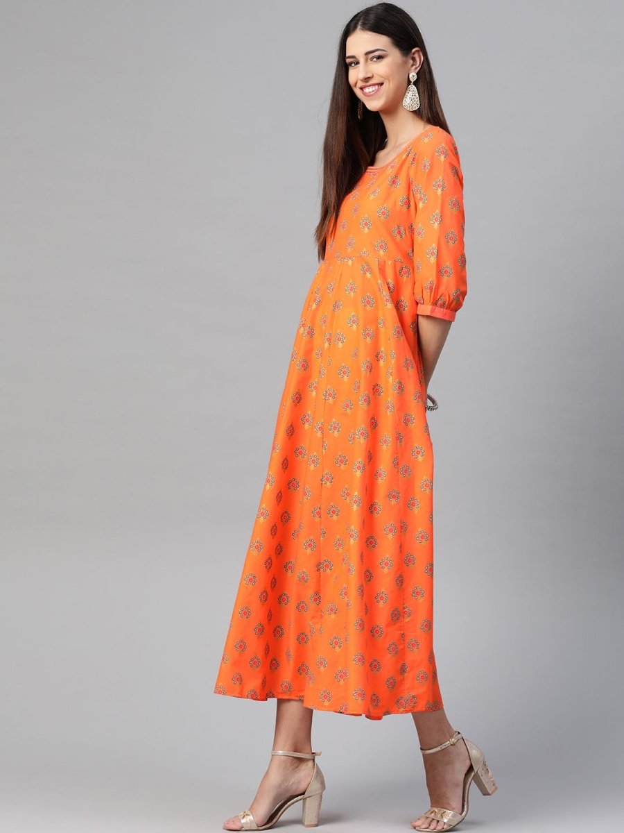 AURELIA Orange & Blue Floral Pure Cotton Ethnic A-Line Midi Dress - Distacart