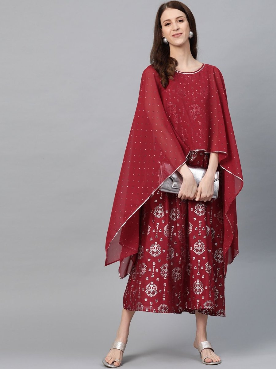 AURELIA Printed Cape Maxi Cotton Dress Product Details Maroon and Silver printed woven cape maxi dress with sequinned border, has a round neck, ...