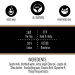 • Goats Milk, Jojoba Oil, Apricot Kernel oil, 100% Natural emulsifiers, Glycerine, Aloe vera, and Natural Preservatives.