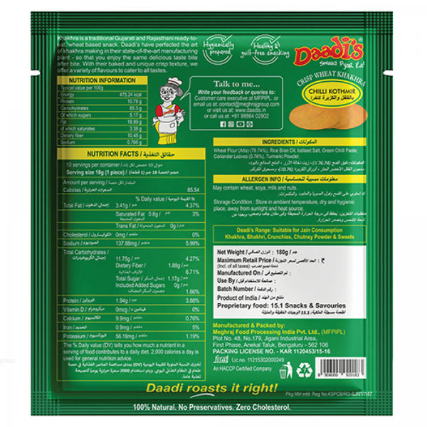 Daadi's Chilli Kothmir KhakhraAbout the Product:Now with the goodness of Kothmir (coriander). For all the spicy food lovers, this seriously is a Ch...