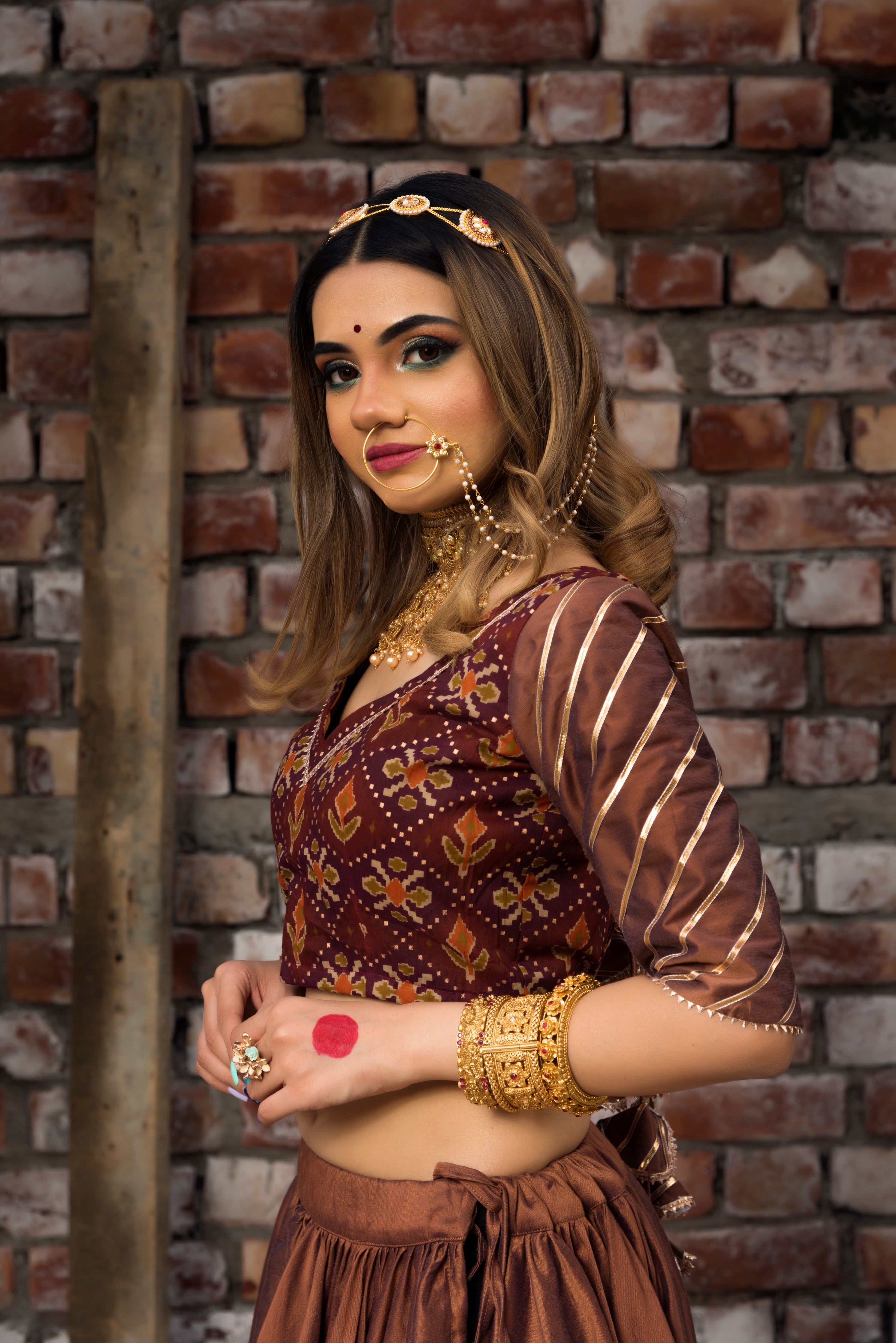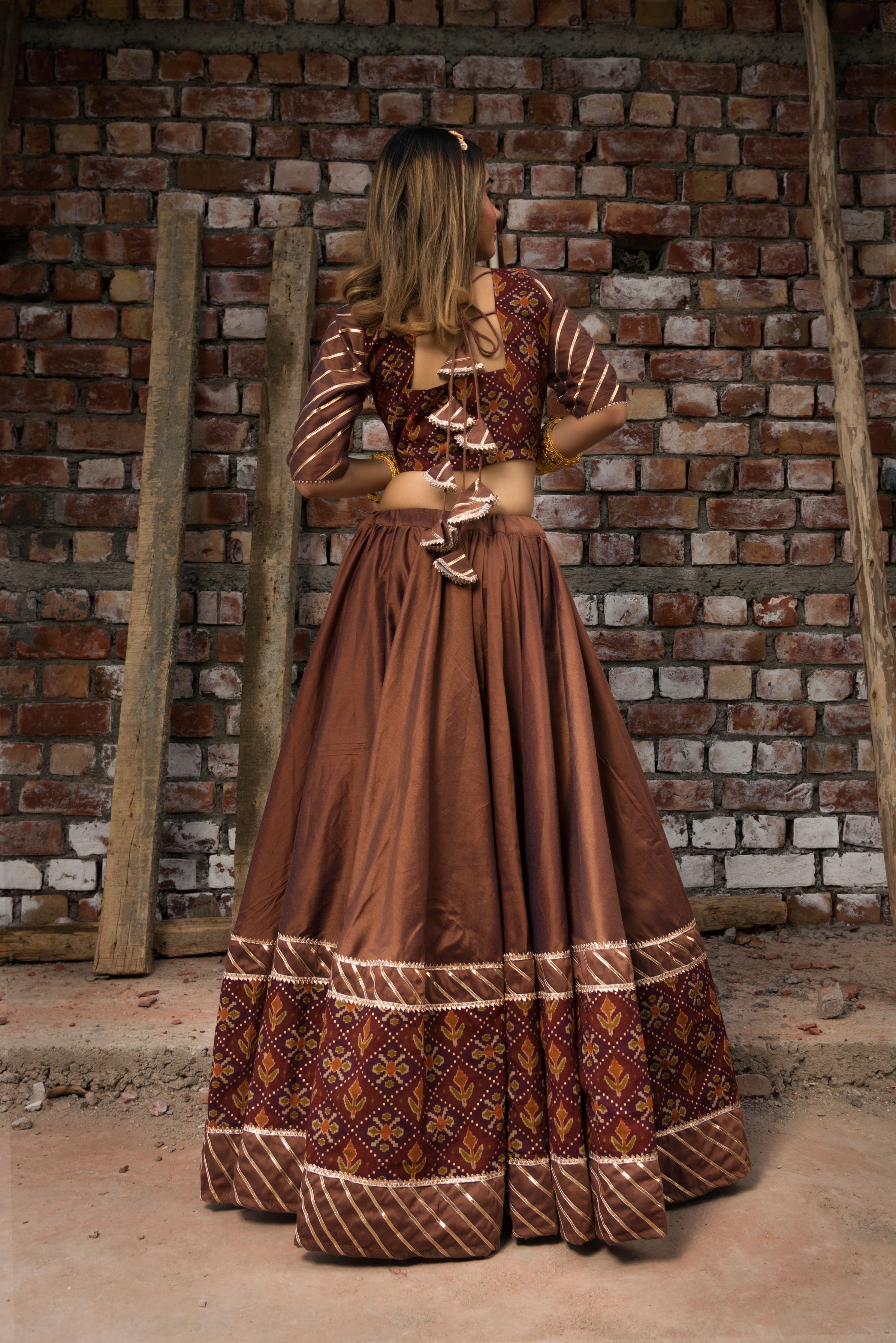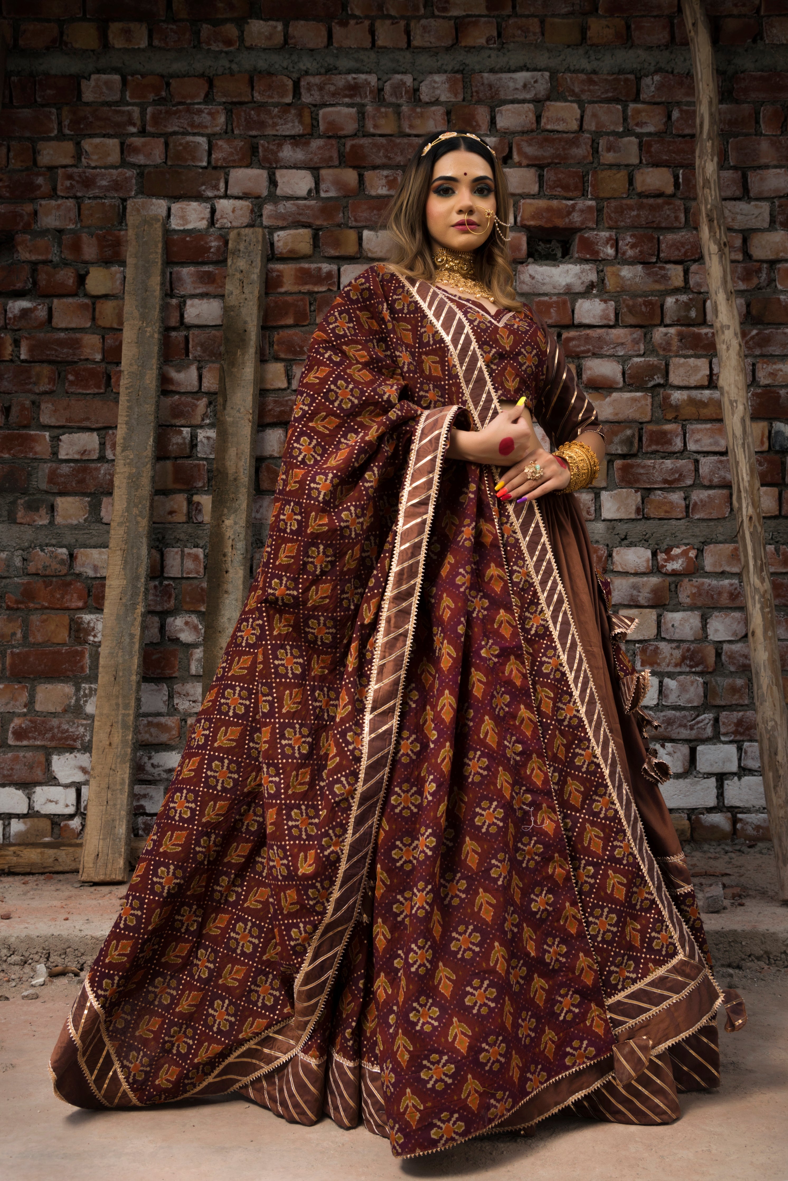 Pomcha Chhaya Brown Gujarati Lehenga Set