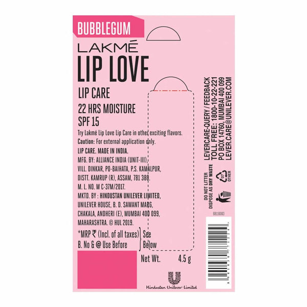 Lakme Lip Love Gelato Chapstick - Bubblegum,4.5g A bright Gelato treat for your soft and smooth lips all day! 22 Hrs Moisture SPF 15 helps protect ...