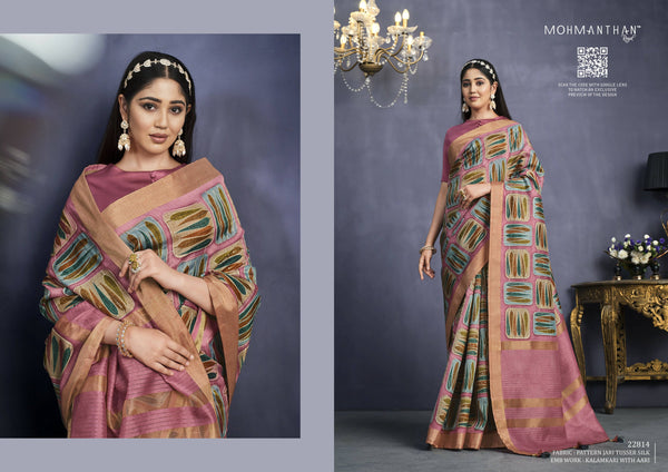 Fashion trends in 2023 is going to be the pick of artwork with soothing styles. Having said that, we bring you the treasure house of art work in our new collection AAHANA under our Mohmanthan brand. With new designer collection of Kalamkari with Aari work, combined with superb embroidery work in Tusser silk, is waiting for your attention to be grabbed in its first look. As the name suggests, Aahana, bring its meaning to surface like the first ray of the sun. These glimmering trendy design, are just the way you always wanted it right, the way you felt it needed. Remember, you are unique and one of its kind. So does your fashion should be. Take your stand now.