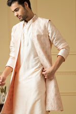 The Nehru jacket design embodies classic refinement with its mandarin collar and sleek silhouette. It is tailored to perfection, ensuring a comfortable and flattering fit. The combination of the peach and pastel green hues creates a harmonious blend, making this jacket a versatile choice for various occasions.